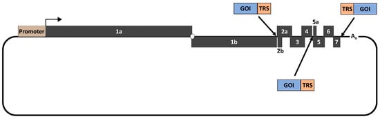 Schematic representation of the potential locations where a gene of interest (GOI) can be inserted into the PRRSV genome. When a GOI is inserted between ORF1b and ORF2a or between ORF4 and ORF5a, its expression will be driven by a transcription regulatory sequence (TRS) located in ORF1b and ORF4, respectively. Consequently, an additional TRS needs be incorporated to the GOI 3′ terminus to drive the expression of ORF2a and ORF5. When the GOI is inserted between ORF7 and the 3′UTR, the TRS needs to be incorporated upstream of the GOI to drive its expression.