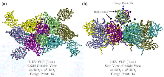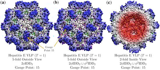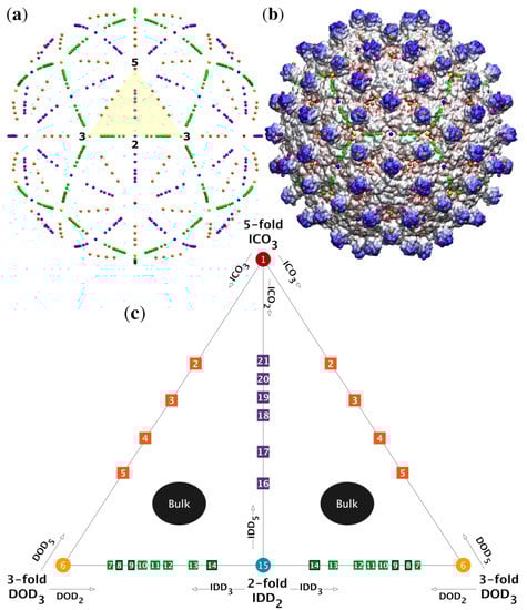 The radial and angular locations specified by point arrays serve as contact points for proteins, as well as external and internal material boundaries. The majority of points are located on the icosahedral great circles. See Figure 5, Figure 7 and Figure 8 for examples of radial distributions of point arrays. We interpret these locations as boundary constraints in the sense of Janner’s encasing forms [,,,,], for the protein capsid and genetic material contained within.