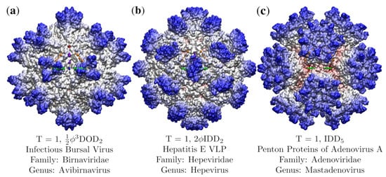 - Twarock, R.; Luque, A. Structural Puzzles in Virology Solved with an Overarching Icosahedral Design Principle. Nat. Commun. 2019, 10, 4414. [Google Scholar] [CrossRef] [PubMed]