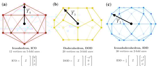 The three standard polyhedra with icosahedral symmetry and the affine extension translation vectors. (a) The 12 vertices of the icosahedron are on the six 5-fold axes, and the structure is generated by applying all 60 icosahedral rotations on a single point , which also serves as the translation vector . (b) The 20 vertices of the dodecahedron are on the ten 3-fold axes, and the structure is generated by applying the full icosahedral group to the point , which also serves as the translation vector. (c) The 30 vertices of the icosadodecahedron are on the fifteen 2-fold axes, and the structure is generated by applying the full icosahedral group to the point , which serves as the translation vector.