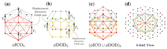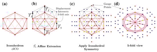 For example, is an admissible scaling length for of , which results in an intersection of displaced vertices at a 3-fold axis, thus reducing the cardinality. This process is illustrated in Figure 4. We represent this point array as , which is the union (∪, combination) of the base polyhedron and the point cloud generated by the 60 icosahedral rotations of the translated vertices .