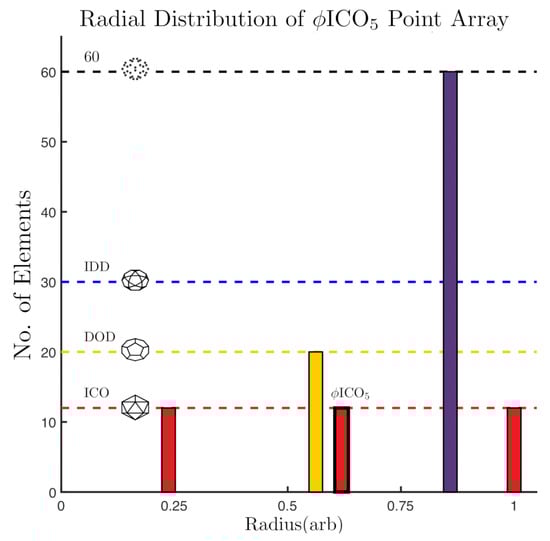 The first 41 point arrays [] are created when these translated vertices intersect at icosahedral symmetry axes, leading to arrays with additional polyhedra representations of 2-, 3- or 5-fold symmetry, now at two or more radial levels (Figure 5). The additional 14 point arrays [] are created from intersections near, though not on symmetry axes. This means that they do not create any new icosahedral polyhedra at different radial levels, though they still reduce the cardinality from the free group representation. These point arrays are representations of the group symmetry across multiple radial levels. It can readily be shown that this set of 55 point arrays is complete and that there are no additional point arrays as there are no further symmetry axes or displaced vertices to intersect.