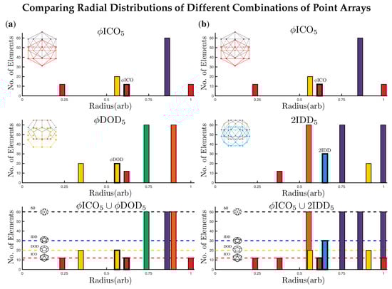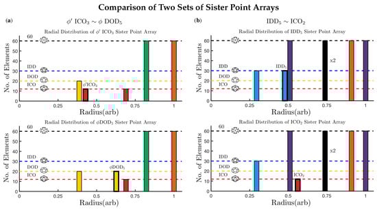 The radial distribution of point clouds for sister point arrays are identical, except for the base arrays (shown in bold outline). In (a) is identical to except for their two bases and . Please note that these point arrays have different affine extensions, so they cannot be combined. In (b) is identical to except for and . The bulk points at have two sets of 60 points one on the left and one on the right side of the 5-2 great circle in the AU. While these points have the same radius, they are not equivalent locations.