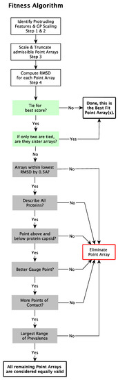 The most important discriminant in this process is step 1, determination of the protruding features and the admissible gauge points. Afterwards when point arrays have comparable RMSD values, we consider point arrays which pass criteria (b) and (c) to be the best fitting point arrays. If a tie still exists, we consider steps (d)–(f) in order, though most point array fits are determined by step (c). When ties still exist, we report both point arrays, which is a common occurrence with sister point arrays, which we consider to be equally valid (indistinguishable) (Figure 9). These ties might further be broken by including genetic material where available. The results of this algorithm for the viruses studied in this paper can be found in Table 3.