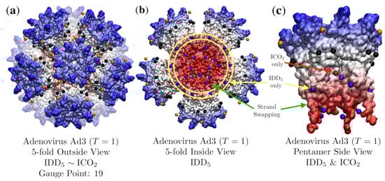 A structural comparison showing the wide diversity in viral capsid shapes of even the simplest viruses. Each virus capsid has been radially colored, with red being the most interior, and blue the exterior. These three, (a) Infectious Bursal Virus (Avibirnavirus, 2gsy []), (b) Hepatitis E Virus-like particle (Hepevirus, 3hag []), and (c) Penton Base of Adenovirus A (Mastadenovirus, 4aqq []), were chosen as they have almost no overlap in their protruding features. The best fit point array for each capsid is listed. We will see that these point arrays describe unique features and complement the T-number classification. The asymmetric unit of each capsid is contained by the triangular region of gauge points (Figure 1).