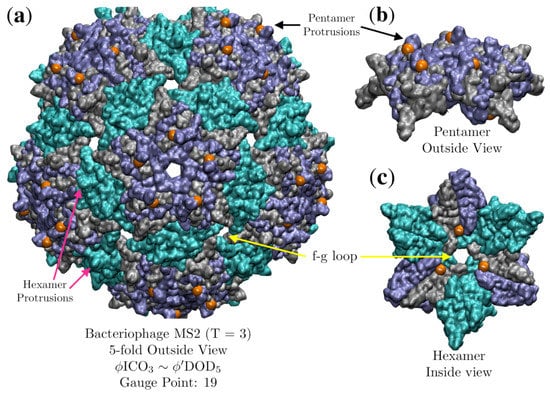 (a) Bacteriophage MS2 (T = 3, 2ms2 []), viewed down the 5-fold axes, is fitted best by with an RMSD of 0.7 Å and Gauge Point 2. Equivalent capsid proteins are colored blue, gray and cyan. Though this fit uses only 2 of the 5 radial levels of the point arrays, its agreement with experiments is remarkable, as it is nearly impossible to substitute different amino acids near the gauge points (orange) [,]. (b) A perspective view of the gauge points sitting right next to the pentamer protrusions, which were found to be nearly immutable, suggesting this geometric location is critical to the stability of MS2. As MS2 is composed of 180 chemically identical proteins, the hexamer protrusions are similarly immutable, at least pre-assembly of the capsid. (c) It was shown that the f-g loop which is the inner surface of the hexamer hole was very mutable, which is also in agreement with the point array fit, as the restricted points are several angstroms away (orange). Directly above these points are the -sheets.