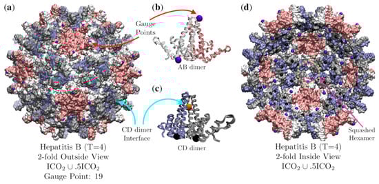 The Hepatitis B (T = 4) capsid is composed of 120 protein homodimers and is best fitted by the double base point array with has an RMSD of 1.3 Å. There are two distinct dimeric units, the AB and CD dimers, which have the same primary and secondary structure, though differ slightly in their tertiary structures when part of the capsid (Figure 16). Each of these dimeric units are sandwiched between elements of the point array (Figure 16b,c). The geometric constraints on the AB and CD dimers are not equivalent as the AB dimer is restricted to meet at the top of the -helices and the CD dimer near the center of the -helices interface. If we treat the elements of the point arrays as equilibrium points for thermal fluctuations of the capsid, we would expect the dimers to have different flexibility parameters. We would expect the AB dimer to be stiffer than the CD dimer, as it has fewer fluctuations which leave it in contact with the gauge point at the top of the dimer and the point below (Figure 16b). In contrast, the CD dimer has more fluctuations available which leave the -helices in contact along their interface, and the points below (Figure 16c). This difference was indeed observe by Hadden et al. [] in their enormous all-atom, non-symmetry enforced, molecular dynamics simulation of HBV over a timescale of with time steps. They found that the CD dimers were more flexible than the AB dimers. Their simulation also found that the capsid was never truly converged to an icosahedral capsid despite the long relaxation time, which could imply that the virus only has icosahedral symmetry on average. Another interesting feature of the HBV (T = 4) capsid is that the hexamers are centered on 2-fold axes, which is consistent with T = 4 geometries. This requires that the hexamers have 2-fold rather than 3-fold symmetry. The hexamers accomplish this by arranging the CD dimers and AB dimers differently, creating a squashed 2-fold symmetric hexamer (Figure 16d).