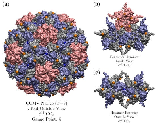 (a) A look down the 2-fold axes of CCMV (T = 3, 1cwp []) which is best fitted by with an RMSD of 0.7 Å and Gauge Point 5. The pentamers are shown in pink and the hexamers are gray and blue. (b) Inside the capsid view of the points as they coordinate the pentamer and hexamer meeting. (c) Outside view of the hexamers. The pentamer proteins only make contact with one point, though the hexmamer unit makes contact with 3 points, above, below and at their junction.