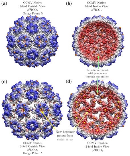 Numeric studies of the normal modes of the protein capsid showed that for CCMV, the dominant change in structure during maturation could be captured through the breathing mode, or roughly uniform expansion of the protein components []. Given that the mature state is still well characterized by the native state array, though with a larger radius, this is consistent with uniform radial expansion. One aspect which is not captured in their numeric studies however is the changing shape of the interior of the hexamer which now makes the sister point array viable (Figure 18d).