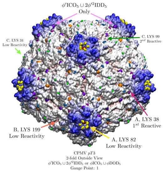 CPMV (pT3, 1ny7 []) has five solvent exposed exterior lysine residues found to be reactive which are labeled here by the protein domain they occupy []. There are two point arrays and that fit equally well with an RMSD of 1.5 Å and Gauge Point 1. This agreement is not surprising, as their truncated point arrays are identical except for a single point (purple) along the 5-2 GC. The geometric restrictions of the point arrays are in remarkable agreement with the reactivity data [], explaining at least 4 of the 5 reactivity sites (Table 5).