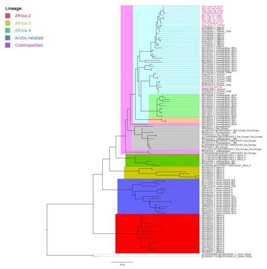 Phylogenetic analysis of rabies virus isolated from wild canidae in Tunisia. Cosmopolitan lineage (highlighted in purple) comprises Africa-1a (light blue), Africa-1b (light green), Africa-1c (orange), and fox-related strains (grey).
