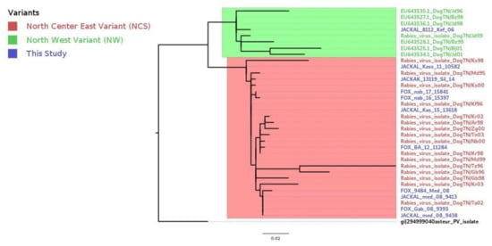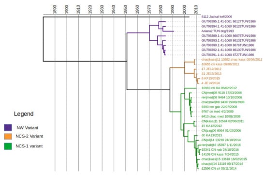 We compared viruses associated with foxes and jackals in Tunisia with variants previously identified in Tunisian dogs, which were downloaded from GenBank. The resulting ML tree is displayed in Figure 2, showing that variants found in Tunisian wild canids cluster together with those identified in dogs. The phylogenetic tree was further divided in two sub-clades that were independent from the host species but related to the area of sampling, identified as northwest (NW) and northeast–center–south (NCS). All viruses isolated from wild canids clustered with high support within the northeast–center–south (NCS) sub-clade, except for the isolate 8112, associated with a jackal found in 2006 in the El Kef governorate (northwest of Tunisia). Another interesting result was that isolate 10582, associated with a jackal that originated from the Kasserine governorate (center west) in 2011, was mostly related with the isolate DogTN/Ks98 (isolated from Kasserine in 1998). Although they belonged to the NCS sub-clade, they did slightly deviate from other NCS isolates. This deviation was supported by a node with high bootstrap values (100%). The old Tunisian isolates, downloaded from GenBank (Tunisia 1986), also belonged to the NW sub-clade.
