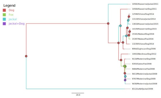 Animals suspected to be dead from rabies infection were collected by the veterinary services and sent to the IPT laboratory to undergo necropsy, brain extraction and rabies testing using a FAT test, as recommended by the OIE and the World Health Organization (WHO) [,]. All samples that tested positive for rabies were stored in the rabies laboratory biobank. In total, we selected 11 brain samples collected from wild animals, namely five foxes and six jackals, and 14 brain samples isolated from domestic dogs in the same location and during the same period of time (same delegation, same month), as shown in Table 1. These samples were characterized and integrated into the phylogenetic analysis together with additional sequences downloaded from GenBank.