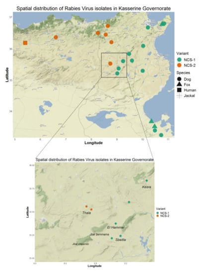 - Amouri, I.K.; Kharmachi, H.; Djebbi, A.; Saadi, M.; Hogga, N.; Zakour, L.B.; Ghram, A. Molecular Characterization of Rabies Virus Isolated from Dogs in Tunisia: Evidence of Two Phylogenetic Variants. Virus Res. 2011, 158, 246–250. [Google Scholar] [CrossRef] [PubMed]
