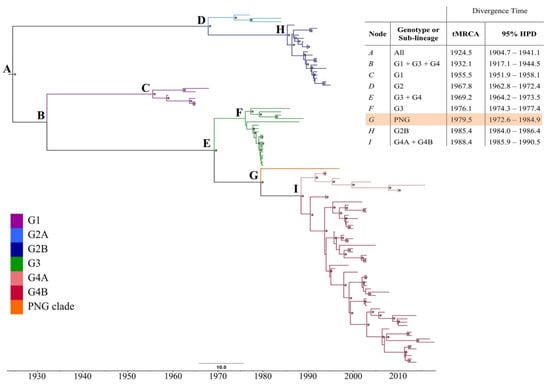The median root age of the entire 105-taxon dataset was estimated as July 1924 (mean: 1924.5, 95% highest probability density (HPD) 1904.7–1941.1) under a relaxed clock. The estimated mean nucleotide substitution rate was 3.06 × 10−4 (95% HPD 2.62–3.54 × 10−4), consistent with previous estimates of alphavirus evolutionary rates [,,]. Each major genotype of RRV, as well as the newly described PNG clade, emerged in approximately decade-long intervals, consistent with our previous genome-scale investigation of RRV [].