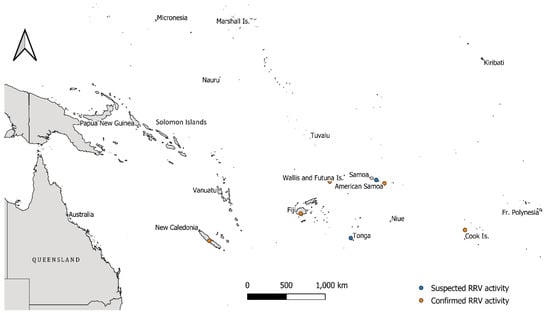 RRV is currently considered to be both a mosquito vector species and amplifying host generalist, with macropods (such as wallabies and kangaroos) considered the major reservoir host for RRV maintenance and transmission []. Humans have been implicated as short-term amplifying hosts during disease epidemics including the large-scale, virgin-soil epidemic that occurred across multiple Pacific Island countries and territories (PICTs) from 1979 to 1980 [,,]. Cases were reported from Fiji, American Samoa, the Cook Islands, New Caledonia and Wallis and Futuna, with disease suspected in northern Tonga []. Samoa did not report cases during this time, but during an April 1980 investigation of a dengue outbreak, high titres of anti-RRV haemagglutination inhibition (HI) antibody were detected. RRV activity likely occurred in Samoa during the 1979–1980 outbreak but went undetected []. Viraemic travelers are the suspected mode of rapid spread between these adjacent island nations [].