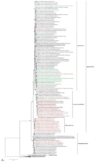 The viral sequences obtained in this study have been submitted to GenBank under accession numbers MK617357-MK617517. However, in order to make the phylogenetic tree more readable, 72 virus sequences were selected from a total of 161 submitted sequences, the choice being mainly based on their representativeness among given bird order/species.