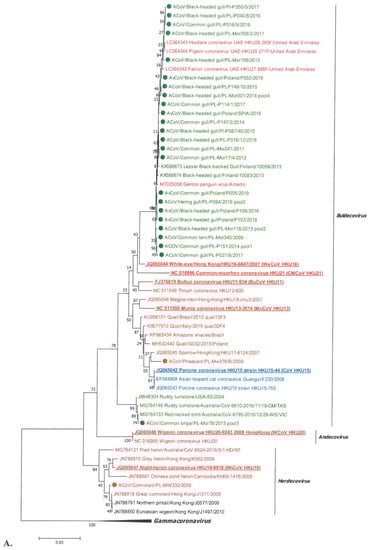GammaCoVs were detected in six orders of birds with a prevalence of 3.5%. Only gammaCoVs were detected in Anseriformes (3.51%), while their presence was also found in Charadriiformes with a similar frequency (3.14%). In addition, these viruses were also detected in Columbiformes, Galliformes, Gruiformes, and Passeriformes. In contrast, the prevalence of deltacoronaviruses was lower and amounted to 0.65%. The presence of these viruses was detected in birds belonging to three orders, Charadriiformes, Galliformes, and Suliformes, which may indicate a narrower host range than for gammaCoV. Deltacoronaviruses were most frequently detected in gulls, which appeared to be a common host for both gamma- and delta-CoV. This phenomenon is similar to what has been observed with regard to avian influenza virus, as a number of subtypes of this virus were detected in Laridae family, including the most important, H5, H7, and H9. This may be due to the specificity of this bird family. Shorebirds are found all over the world, occupying diverse ecologic niches. They also differ in their ability to migrate—some migrate between continents, and others are sedentary. Furthermore, shorebirds are species that are ecologically associated with humans and domestic animals, ranging from frequent direct contact resulting from sharing the same environment, to very occasional contact. The diet of Laridae is also a factor contributing to the infection of various viruses. They are generally omnivores, although they are most likely to consume invertebrates and fish—some species eat sick or dead animals, thus facilitating the direct transmission of various pathogens. Moreover, Laridae breed in high-density colonies, where contact between infected individuals can easily occur [].