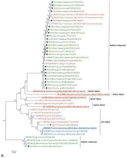 A phylogenetic analysis of 26 detected deltacoronaviruses revealed that most of them belonged to the Buldecovirus subgenus and only one belonged to Herdecovirus. No virus of the Andecovirus subgenus was detected. The indicated viruses of the Buldecovirus subgenus are characterized by a high genetic variation. Strains from gulls formed the Buldeco-subgroup1, with viruses detected in gulls from Finland, but also in other bird species such as hubara bustard, pigeon, and falcon from the Middle East and Gentoo penguin from the Antarctic [,,,]. However, these viruses are not represented by any ratified virus species, although such a need has been previously indicated [,]. The fact that of the 26 deltacoronaviruses analyzed, as many as 23 from Laridae belonged to the same Buldecovirus subgroup1, suggests the species specificity of this group. Although viruses from birds of different families (bustards, pigeons, falcons, and penguins) were also included in this subgroup, their occurrence appears to be sporadic and may result from sharing the same habitat with gulls (e.g., penguins) or their eating habits (the presence of similar viruses in falcon, hubara, and pigeon caught in the same area was interpreted as a consequence of the food chain) []. Another interesting buldecovirus strain from Charadriiformes has been identified in common snipe of the Scolopacidae. This strain formed a separate Buldeco-subgroup2 together with deltaCoVs found in other Scolopacidae species, i.e., in ruddy turnstone from the USA and Australia, and red-necked stint from Australia [,]. As before, the distinctiveness of this group was supported by the high value of the calculated SH-aLRT coefficient, and the lack of a representative of the group as a ratified species was also noted. However, while the viruses clustered in the Buldeco-subgroup1 mainly originated from the birds of Laridae, as well as from other orders, the Buldeco-subgroup2 seemed to be highly species specific only for birds of Scolopacidae. Only one buldecovirus identified in the pheasant of the Galliformes was placed in the subgroup represented by the species ratified by ICTV—porcine coronavirus HKU15. This subgroup also included other mammalian deltaCoV, from pigs and Asian leopard cat, as well as birds, detected in species such as sparrow, quail, and red amazon [,,,]. The only deltacoronavirus of the Herdecovirus subgenus was identified in the cormorant. Interestingly, viruses of this subgenus seem to be species specific, as most were detected in birds of Pelecaniformes, as they were identified in the herons in Australia, and in herons and cormorants in the Mai Pohes nature reserve in Hong Kong [,]. The presence of herdecoviruses has also been identified in Anseriformes, northern pintail, and Eurasian wigeon, but rather sporadically [].