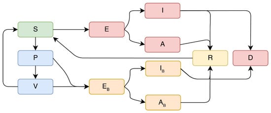 Given that, in real-world situations, the vaccination rate is rarely a linear function defined by a constant daily dose, our model incorporates a piecewise function of the vaccination rate based on the applied daily doses from 20 December 2020 to 31 October 2021 []. Different ranges for the vaccination rate are shown in Table S2. The value of is the average value of the doses applied in the interval of days described in Table S2.