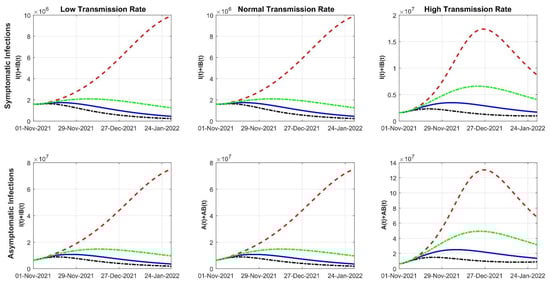 Using this model, we evaluated how different VRs might affect the spread of the SARS-CoV-2 delta variant. We further considered low, normal, and high transmission rates, which could reflect different implementation levels of nonpharmaceutical strategies (NPI). Figure 2 shows the projections of new SARS-CoV-2 symptomatic and asymptomatic infections, which included the modeled solutions assuming no vaccination (red dotted line), 50% decrease of VR (green dotted line), baseline VR (blue solid line), and 200% VR (black dotted line). Regardless of the transmission rate, the case counts would rise exponentially in a hypothetical US population with zero vaccination. Given a low transmission rate, new infections would plateau to 2.00 × 106 symptomatic cases per day given 50% VR until the end of December 2021. Given a baseline VR, symptomatic cases would plateau in the third week of November at a value of 1.85 × 106. For 200% VR, symptomatic cases would reach a value of 1.62 × 106 before tapering down between November and December of 2021. The forecast for asymptomatic individuals would behave in a similar manner as symptomatic individuals (Figure 2). Under a normal transmission rate, a US population with 50% VR would rise to a peak of 2.0 × 106 symptomatic cases and 1.85 × 107 asymptomatic cases per day. In comparison, the baseline and 200% VR population would have a more moderate pandemic, peaking at 2.0 × 106 and 1.86 × 106 symptomatic cases per day, respectively (Figure 2). Under a high transmission rate, the new infection counts would be significantly higher even under a baseline VR, reaching a peak of up to 0.45 × 107 symptomatic cases and 2.2 × 107 asymptomatic cases per day. A 200% VR would best control the pandemic in this high transmission rate population, where the peak of new daily infections would still rise to 0.25 × 107 symptomatic cases and 1.85 × 107 asymptomatic cases (Figure 2). Under 200% VR, the cases would start to decrease between November and December 2021, and this trend would continue through January 2022 with daily infections of approximately 0.1 × 107 symptomatic cases and 1.00 × 107 asymptomatic cases. Regardless of the transmission rate, there would be a much higher number of individuals recovered from the disease mostly due to more infections (Figure S3A,C,E). There is a slight difference in recovered dynamics based on the different VRs (Figure S3A,C,E). Compared to a 50% decrease of the baseline VR, a higher VR is projected to reduce roughly 250,000 deaths if the US maintains the baseline VR and 300,000 deaths if the VR is accelerated to 200% (Figure S3B,D,F).