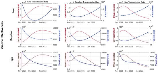 The assumed vaccine effectiveness () parameter under each scenario is denoted on top of each panel and is inferred based on real-world data of individuals receiving two doses of the BNT162b2 vaccine []. The heatmaps in the left row consider a low transmission rate, the heatmaps in the center row panels consider a baseline transmission rate, and the heatmaps in the right row panels consider a high transmission rate.