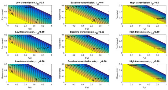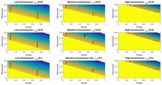 Control reproduction number for symptomatic transmission considering partial immunity and recovered individuals. The assumed vaccine effectiveness () parameter under each scenario is denoted on top of each panel and is inferred based on real-world data of individuals acquiring partial immunity as those induced by one dose of the BNT162b2 vaccine []. The heatmaps in the left row consider a low transmission rate, the heatmaps in the center row panels consider a baseline transmission rate, and the heatmaps in the right row panels consider a high transmission rate.