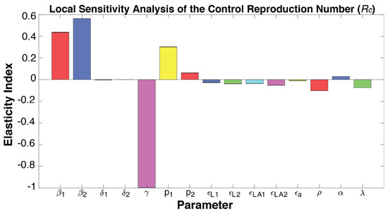 The sensitivity analysis of the control reproduction number was carried out using the following definition []: If is differentiable with respect to a given parameter , then the normalized forward sensitivity index of is defined by: