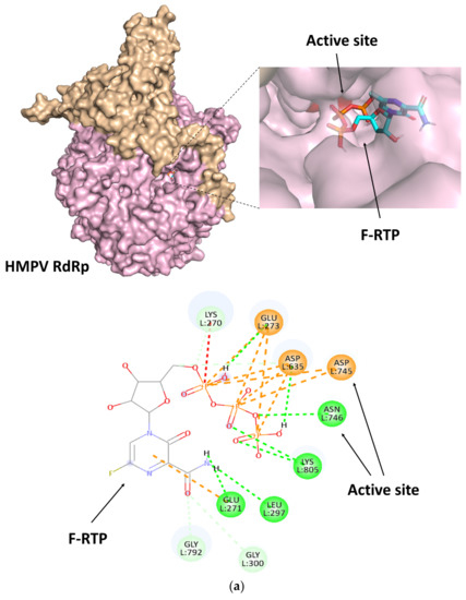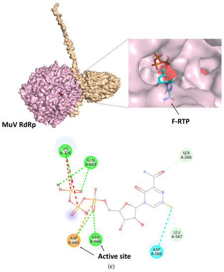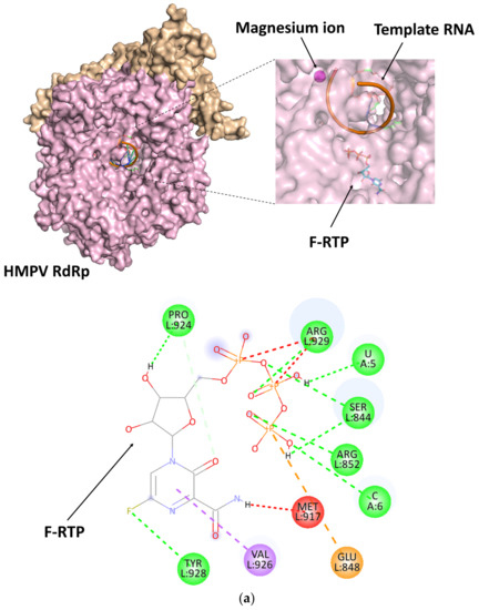 As shown in Figure 3, in all RdRp proteins, F-RTP bound to the template RNA; however, the interaction forces varied: HMPV: electrostatic interactions (attractive charge), hydrogen bonds (carbon and conventional), pi-sigma interactions, and unfavorable interactions (donor–donor and positive–positive); RSV: electrostatic interactions (pi-cation), hydrogen bonds (carbon and conventional), and hydrophobic interactions (pi-alkyl); MuV: electrostatic interactions (attractive charge), halogen bonds, hydrogen bond (conventional), and hydrophobic interactions (amide-pi stacked); MeV: electrostatic interactions (attractive charge and pi-cation), halogen bonds, hydrogen bonds (conventional), and hydrophobic interactions (pi–pi T-shaped); influenza H1N1, electrostatic interactions (attractive charge), hydrogen bonds (carbon, conventional, and pi-donor), pi-sigma interaction, and unfavorable interaction (acceptor–acceptor).