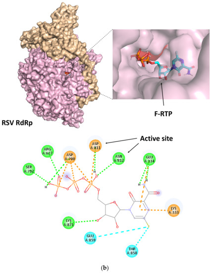 These interactions may be responsible for electrostatic interactions and hydrogen bonds. It is suggested that aspartic acid residue is a common amino acid in various RNA viral RdRp active sites because this amino acid interacts with magnesium ion as an essential component for viral genome replication [49,50]. Taken together, F-RTP may be associated with the inhibition of viral genome replication when aspartic acid residue is present in RdRp active sites. To the best of our knowledge, this is the first study to show interactions between F-RTP and aspartic acid residue in the RdRp active site.