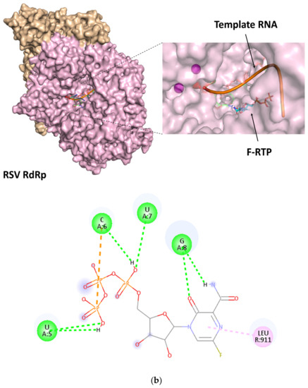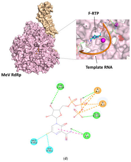 The interacting sites of the template RNA also varied and included all four types of bases. Magnesium ions did not interact with F-RTP in the docking simulation. The binding energies between F-RTP and the RdRp proteins of HMPV, RSV, MuV, MeV, and influenza H1N1 were calculated as −7.1, −7.7, −7.0, −7.7, and −7.6 kcal/mol, respectively.