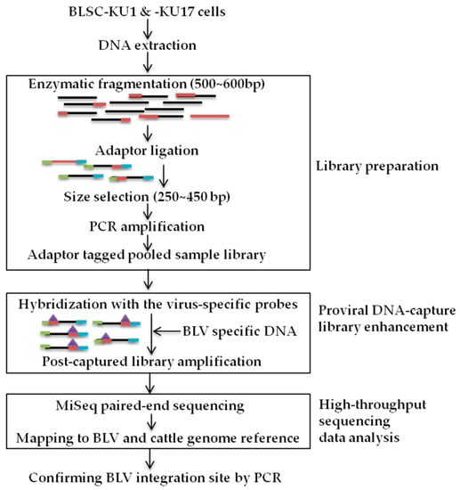 - Ohnuki, N.; Kobayashi, T.; Matsuo, M.; Nishikaku, K.; Kusama, K.; Torii, Y.; Inagaki, Y.; Hori, M.; Imakawa, K.; Satou, Y. A target enrichment high throughput sequencing system for characterization of BLV whole genome sequence, integration sites, clonality and host SNP. Sci. Rep. 2021, 11, 4521. [Google Scholar] [CrossRef]