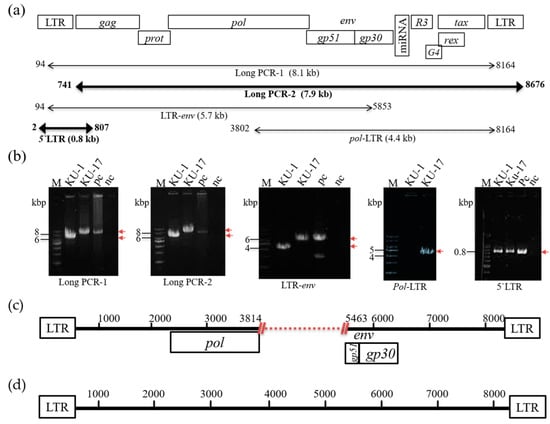 To further confirm the genomic structure of the BLV provirus integrated in BLSC-KU1 and BLSC-KU17, we performed whole genome sequencing using the PCR product of long PCR-2 and 5′-LTR. As expected, the sequencing results clearly confirmed that the deletion of BLV provirus (7063 bp) in BLSC-KU1 was from nucleotide position (nt) 3814 to nt 5463, spanning the C-terminal of pol and most of the env-gp51 gene (accession number: LC682198) (Figure 2c). The failure of pol-LTR PCR amplification can be explained by the sequence result showing a deletion in part of the pol gene around the PCR primer binding position. Our sequencing results are in agreement with Southern blot analysis of a previous publication []. In contrast, we obtained the full BLV genome sequence (8714bp) of BLSC-KU17, as schematically presented in Figure 2d (accession number: LC681771).