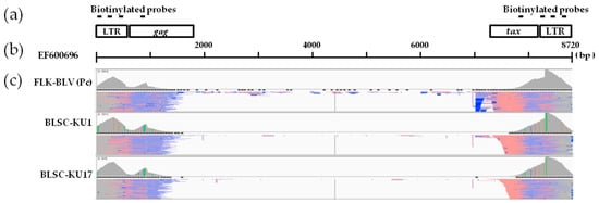 Visualization of paired-end short read sequences mapped to the BLV reference FLK-BLV sequence (EF600696). (a) The schematic structure of the biotinylated probe targeting region. Horizontal lines indicate biotinylated probes. (b) The schematic length of the BLV reference FLK-BLV sequence (EF600696). (c) The visualization of the mapping of paired-end reads of positive control FLK-BLV, and BLSC-KU1 and BLSC-KU17 cell lines obtained using next-generation sequencing.