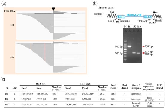 Visualization of BLV integration sites (ISs) in FLK−BLV cells. (a) Visualization of NGS reads mapped to the ovine genome around the ISs. The arrow−head indicates the location of the IS. Sequences of virus−host chimeric reads next to the end of BLV gnome are indicated as host−left and host−right; respectively. (b) Confirmation of detected ISs by conventional PCR. Host indicate ovine FLK cellular genome, the upside−down writing of BLV provirus and LTR indicates that negative strand BLV provirus was integrated. M, molecular weight marker (100−bp DNA Ladder). Numbers besides DNA ladder indicate ladder size. Numbers with arrows in red indicate the target PCR product length. (c) Detailed information of ISs in FLK−BLV cells.
