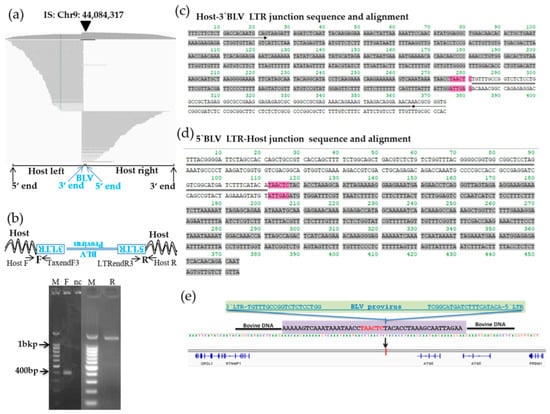 To further confirm the BLV integration site detected by NGS in Chr9 of BLSC-KU17, we designed primers targeting both the host and proviral genome as Chr9F and BLV-TaxendF3 for the host genome 3′-BLV LTR junction, and Chr9R and BLV-LTRendR3 for 5′-BLV LTR–host genome junction (Table S3). These primers were constructed on the basis of antisense orientation of BLV with the host genome. After PCR amplification, we observed about 400 bp and 1.4 kbp of specific target bands in Figure 6b and subjected them to Sanger sequencing using the same PCR primers. Host–BLV junction sequences were successfully obtained as shown in Figure 6c,d. Then, sequences were separately aligned to either the cattle reference genome (Bos_taurus_UMD_3.1/bos Tau8) through Genome Browser Blat tools, or BLV provirus genome sequences through NCBI nucleotide Blast. A total of 6bp of duplicated host sequences were also observed (colored pink in Figure 6c,d). BLV was integrated into the intergenic region downstream of RTN4IP1 and upstream of ATG5 (Figure 6e, Table 2).