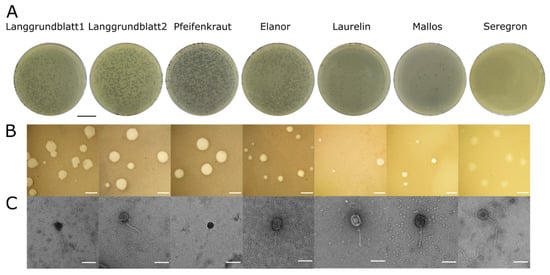 Phage morphology of novel Xanthomonas phage isolates. (A) Plaque morphologies of the seven different phages infecting Xanthomonas translucens pv. translucens (DSM 18974) (Langgrundbatt 1, Langgrundbatt 2, Pfeifenkraut, Elanor, Laurelin, and Mallos) and Xanthomonas campestris pv. campestris (Seregon). Scale Bar: 2 cm; (B) Stereo microscopy of single plaques. Scale bar: 1 mm; (C) Transmission electron microscopy (TEM) images of virion particles. The phage isolates were negative stained with uranyl acetate. Scale bar: 100 nm.
