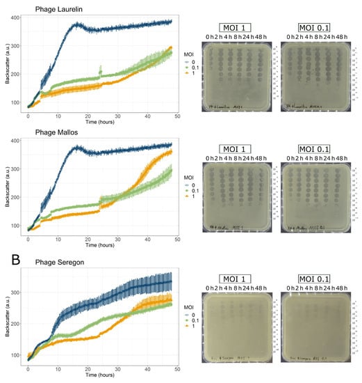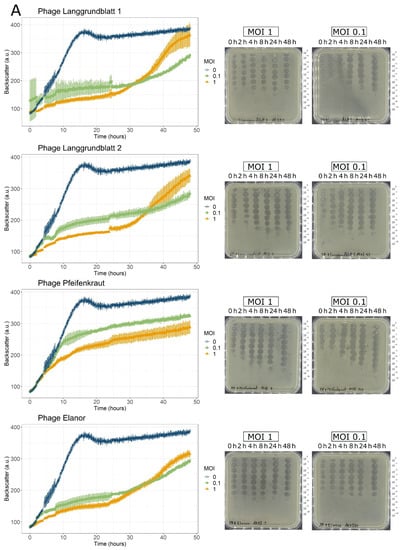 Infection was performed in microtiter plates using the BioLector® microcultivation system (Beckmann Coulter GmbH, Krefeld, Germany). For cultivation, biological triplicates were conducted in 48-well FlowerPlates (Beckmann Coulter GmbH, Krefeld, Germany) at 30 °C and a constant shaking frequency of 1200 rpm. Backscatter was measured by excitation with light of a wavelength of 620 nm (filter module: λEx/λEm: 620 nm/620 nm, gain: 40) in 15 min intervals. Each well contained 1 mL host culture adjusted to an OD600 of 0.2 in NB and an addition of 2 mm MgCl2. Phages were added at a multiplicity of infection (MOI) of 1 or 0.1, respectively, and incubated for 15 min at room temperature without shaking to promote phage adsorption. Sampling was performed at the indicated time points. Subsequently, 3 µL of dilutions were spotted on NB double agar plates containing the isolation host.