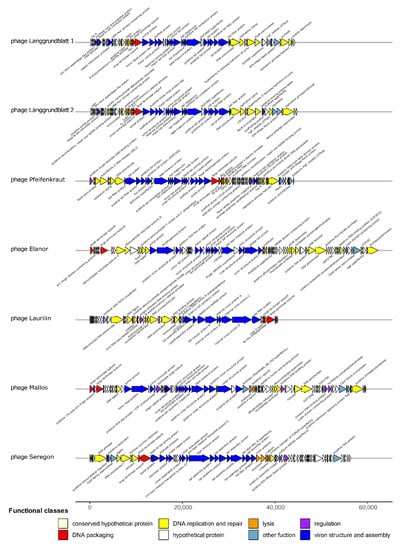 Phages Pfeifenkraut, Langgrundbatt 1, and Langgrundbatt 2 exhibit a remarkably low GC contend (53%) in contrast to their host Xtt (68%). Phage Laurelin differs from the other phages, in that its genome is the smallest, containing only 56 genes. Furthermore, it is the only one of the isolated phages containing 218 bp directed terminal repeats (DTRs). The genomic ends were determined using Phage Term []. In contrast, phages Langgrundbatt 1, Langgrundbatt 2, Pfeifenkraut, Elanor, and Mallos show a headful packing mechanism were the genome is translocated to the capsid at dedicated pac sites [] resulting in variable genome ends. For the phage Seregon, cohesive ends with a length of 12 bp (5′ GGGGGCGCTGAC) were predicted. Since for plant biocontrol the phage lifestyle is of special importance, the lifestyle was predicted using PhageAI, a machine-learning tool which compares the genomes to over 20,000 publicly available phages []. All isolated phages were classified as virulent. This is further supported by the absence of integrase genes within the genomes.