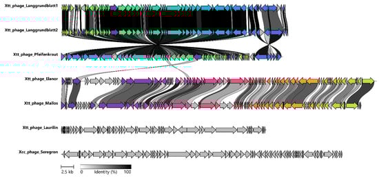 Characterization of the host range assay showed that phages Langgrundblat1, Langgrundblat2, Pfeifenkraut, Elanor, and Seregon are highly specific, only infecting their isolation host and the other plant-pathogenic Xanthomonads but featuring a significantly lower efficiency of plating. Nevertheless, these assays confirmed that they do not infect the majority of the here-tested plant growth-promoting bacteria (PGPB). This shows the advantage of phages as targeted plant biocontrol argent in contrast to other antimicrobials, which also broadly affect the beneficial part of the plant microbiome. Phage Laurilin displayed the highest specificity, only infecting its isolation host X. translucens. In contrast, phage Mallos displayed the broadest host range and also infected the plant pathogenic bacterium Pseudomonas syringae DC3000, making it an omnylitic phage infecting species of two different alphaproteobacterial genera. This makes sense in the context that Xanthomonas and Pseudomonas are among the most abundant genera in the plant phyllosphere []. In addition, a recent study of two phages infecting Pseudomonas syringae pv. tomato DC3000 also finds lytic activity on two Xanthomonas species [].