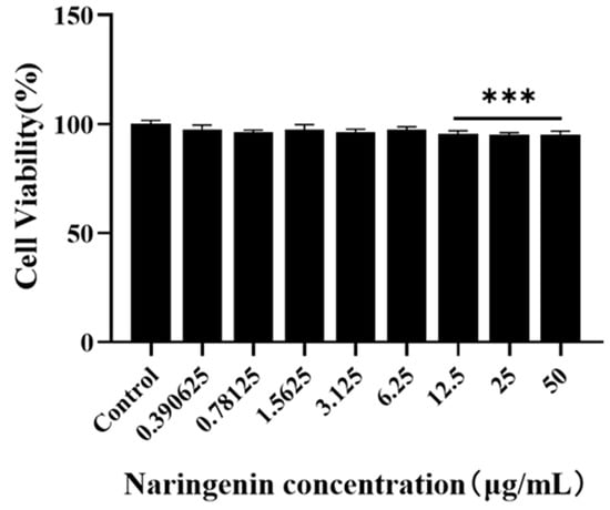 Cell viability was determined by the CCK8 (Sunbao Biotech, Shanghai, China) method. Marc-145 cells were inoculated in 96-well plates at a cell density of 8 × 103 per well and incubated at 37 °C, 5% CO2 for 12 h. After the medium was replaced with DMEM containing 2% FBS, different concentrations of naringenin were prepared (0–50 μg/mL) and continued to incubate in the incubator until 48 h. A quantity of 10 μL of CCK8 reagent was added to each well and incubated at 37 °C with 5% CO2 for 45 min. Absorbance was measured at 450 nm using an enzyme marker.
