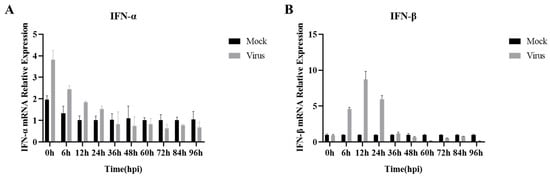 PRRSV infection with mRNA expression of IFN-I at different time periods. (A) IFN-α mRNA expression; (B) IFN-β mRNA expression. Data are expressed as the mean and SD of three independent experiments.