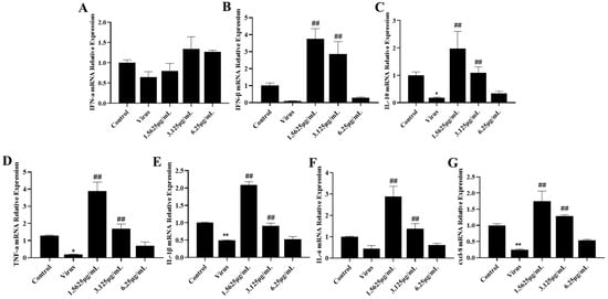 Naringenin up-regulates the expression of immune cytokines. (A) IFN-α mRNA expression; (B) IFN-β mRNA expression; (C) IL-10 mRNA expression; (D) TNF-α mRNA expression; (E) IL-1β mRNA expression; (F) IL-6 mRNA expression; (G) cxcl-8 mRNA expression. Data are expressed as the mean and SD of three independent experiments. ** p < 0.01, * p < 0.05, vs. the virus group. ## p < 0.01, vs. the control group.