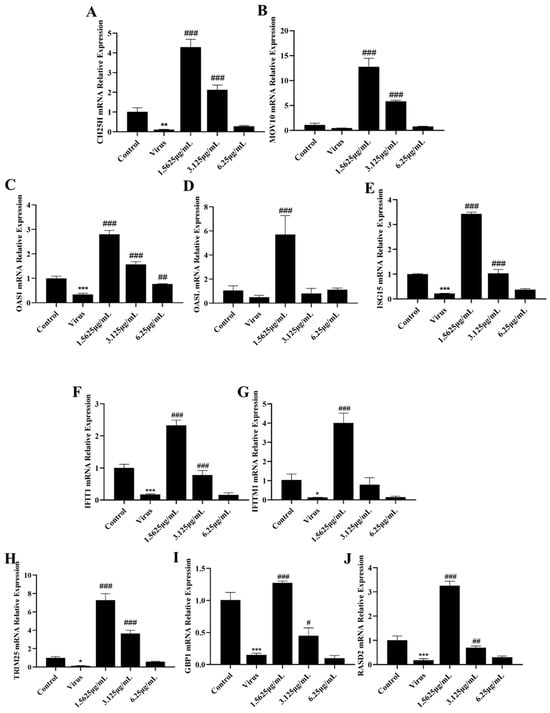 Naringenin up-regulates the expression of ISGs. (A) CH25H mRNA expression; (B) MOV10 mRNA expression; (C) OAS1 mRNA expression; (D) OASL mRNA expression; (E) ISG15 mRNA expression; (F) IFIT1 mRNA expression; (G) IFITM1 mRNA expression; (H) TRIM25 mRNA expression; (I) GBP1 mRNA expression; (J) RASD2 mRNA expression. Data are expressed as the mean and SD of three independent experiments. *** p < 0.001, ** p < 0.01, * p < 0.05, vs. the control group. ### p < 0.001, ## p < 0.01, # p < 0.05, vs. the virus group.