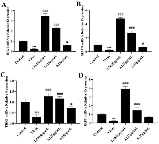 Naringenin up-regulates the expression of genes and proteins related to the RIG-I-MAVS signaling pathway. (A) RIG-I mRNA expression; (B) MAVS mRNA expression; (C) TBK1 mRNA expression; (D) IRF3 mRNA expression. Data are expressed as the mean and SD of three independent experiments. *** p < 0.001, ** p < 0.01, vs. the control group. ### p < 0.001, # p < 0.05, vs. the virus group.