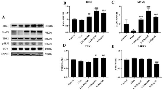Naringenin up-regulates the expression of genes and proteins related to the RIG-I-MAVS signaling pathway. (A) Western blotting analysis of protein expression; (B) RIG-I protein expression; (C) MAVS protein expression; (D) TBK1 protein expression; (E) p-IRF3 protein expression. Data are expressed as the mean and SD of three independent experiments. * p < 0.05, vs. the control group. ### p < 0.001, ## p < 0.01, # p < 0.05, vs. the virus group.