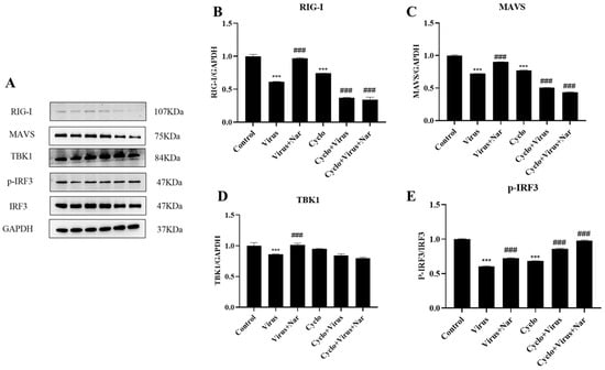 Naringenin exerts innate immunomodulatory effects by modulating the RIG-I-MAVS signaling pathway. (A) Western blotting analysis of protein expression; (B) RIG-I protein expression; (C) MAVS protein expression; (D) TBK1 protein expression; (E) p-IRF3 protein expression. Data are expressed as the mean SD of three independent experiments. *** p < 0.001, vs. the control group. ### p < 0.001, vs. the virus group.
