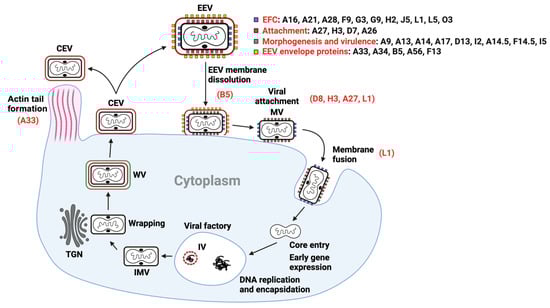 Compared to most enveloped viruses, the structure and replication cycle of OPXVs is complex. The basic infectious form is the mature virion (MV), which is a large (360 × 270 × 250 nm) and brick-shaped particle composed of an outer membrane and a dumbbell-shaped core flanked by lateral bodies []. The outer membrane contains more than twenty surface proteins, comprising four responsible for attachment to target cells, eleven mediating fusion, and several associated with virus morphogenesis and virulence (Figure 1). The core contains a linear dsDNA genome of about 170–250 kbp encoding for more than 200 genes. MVs enter cells either through plasma or endocytic membrane fusion, a process mediated by the entry–fusion complex (EFC). Upon entry, the core is deposited in the cytoplasm and early proteins expressed. Then, the core dissolves, and the genome is released and surrounded by membranes and viral proteins to form a replication factory. Following DNA replication and intermediate/late gene expression, nascent virions are formed and the genome is encapsidated into immature virions (IV), which then mature into intracellular mature virions (IMV), the first infectious form of the virus. Most IMVs remain in the cytoplasm of infected cells until cell lysis occurs, then playing an important role in host-to-host transmissions. However, to spread within the host, some IMVs are covered by an additional double membrane to form wrapped virions (WV), which move to the periphery of cells to fuse with the plasma membrane and release EVs. Tecovirimat, the only drug licensed to treat smallpox and mpox blocks this wrapping step []. EVs that remain attached to the cell are called cell-associated enveloped viruses (CEV), those shedding from the cell extracellular enveloped viruses (EEV). Both EV forms are MVs wrapped with an additional membrane that contains seven EV-specific proteins: four transmembrane glycoproteins on the outer surface (A56, A33, A34, and B5), two proteins attached to A56 (K2 and C3), and one palmitoylated protein on the inner surface (F13). Deletion of any of the genes encoding for these proteins, except A56 and K2, results in decreased virus spread. B5 and A34 play a key role in virus entry, as they mediate the disruption of the outer membrane of EVs, exposing the fusion machinery on the MV [].