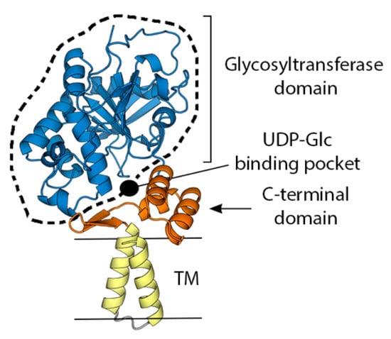 H3 (also known as p35) is a membrane protein consisting of 324 amino acids (37 kDa, 93% sequence identity across pathogenic OPXVs) encoded by the gene H3L. Functionally, H3 is associated with virus attachment to the host cell, contributes to viral morphogenesis, and plays a crucial role in infection []. Electron microscopy images of cells infected with VACV-ΔH3 (a VACV strain lacking H3 expression) revealed impaired virion and decreased virus replication []. The atomic model of H3 (Figure 3) shows a large ectodomain formed by a globular domain with a glycosyltransferase fold (aa. 1–236), a smaller C-terminal domain (aa. 238–287), and two hydrophobic helices (aa. 289–304 and 310–324). These helices are either two transmembrane regions or a transmembrane region and an intravirion tail. Glycosyltransferases are enzymes that catalyze the transfer of an activated sugar to an acceptor molecule: a protein, a lipid, or a glycan. H3 specifically binds UDP–glucose and, akin to functional glycosyltransferases, features a conserved ExD motif that coordinates a divalent cation that is essential for UDP–glucose binding []. In the AF2 prediction, the sugar binding pocket is at the interface with the C-terminal domain, which is disordered in the crystal structure. This suggest that ligand binding may stabilize the interaction between the two domains (Figure 3). H3 binds in vitro and on the surface of mammalian cells heparan sulfate, probably through a positively charged surface. Protein–protein cross-linking mass spectrometry (XL–MS) studies on purified vaccinia virus show that H3 establishes multiple contacts with other MV surface proteins including A17, A27, and A26, with which it forms an attachment protein sub-network, and several contacts with EFC proteins, including A28, F9, G9, L5, and O3 [].