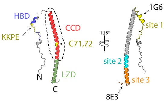 A27 is a protein of 110 amino acids (12 kDa, 94% sequence identity across OPXVs) found on the surface of MV associated with the membrane protein A17. A27 binds heparan sulphate on the surface of host cells, promotes MV wrapping, and regulates the activity of the entry–fusion complex by recruiting A26 onto MV particles []. There is also some debate on whether A27 induces membrane fusion since the α-A27 mAb interferes with virus-induced cell–cell fusion [] and co-expression of A27 and A17 triggers cell–cell fusion at an acidic pH []. The atomic model of A27, as illustrated in Figure 4, shows three functional regions: a heparin binding domain (HBD, aa. 21–34), which is essential for binding to cell surface; a coiled-coil domain (CCD, aa. 43–84), which is required for oligomerization in vivo and contains two cysteines (Cys71 and 72) that may form a disulfide bond with each other or with the cysteines 441 and 442 of A26 [], and a leucine zipper domain (LZD, aa. 85–110), which binds A17 and anchors A27 to the MV surface. As mentioned above, in addition to the above-mentioned A17 and A26, XL–MS experiments suggest that A27 interacts with H3 [].